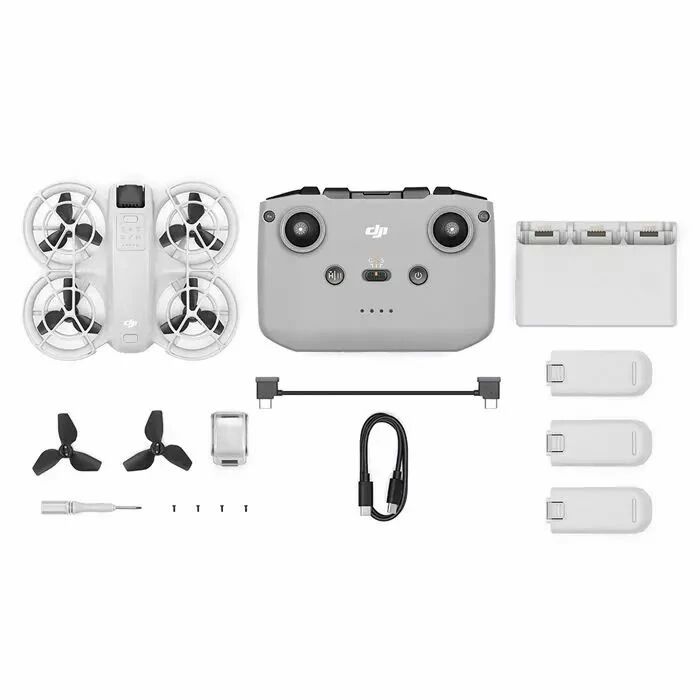 Le DJI Neo propose un stockage interne de 22 Go, suffisant pour 40 minutes de vidéo en 4K à 30p ou 55 minutes en 1080p à 60p. La batterie Li-ion 2S amovible de 1435 mAh offre jusqu'à 18 minutes de vol. La recharge complète se fait en 50 minutes via un port USB Type-C ou une station de recharge bidirectionnelle pouvant accueillir trois batteries. Vous retrouverez dans ce pack Fly More Combo la station de charge avec ses 3 batteries ainsi que la radiocommande DJI RC-N3. Ce qui amène le temps de vol total de ce DJI Néo Fly More Combo à 54 minutes !