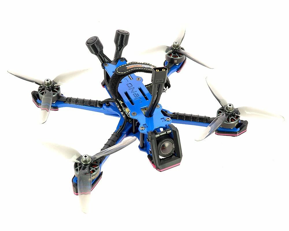 Le JeNo 5.1 Alpine de l'Atelier FPV arbore une superbe couleur bleu Alpine vernis complétée par des TPU de protection avec un petit liseret rose. Pour rester dans le terme du made in France, il est équipé d'un contrôleur de vol Lunpid. Un ESC Velox V50A et les moteurs F40 2150Kv de T-Motor chaussés d'hélices Ethix S5 complète le setup.