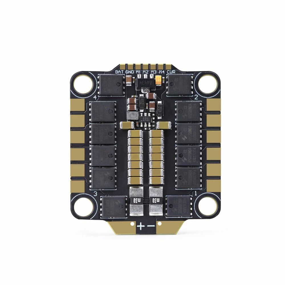 La conception technique facilite l'intégration dans vos builds. L'entraxe de fixation standard 30,5 x 30,5 mm (trous M3) s'adapte à la majorité des châssis du marché. Les larges pads de soudure simplifient les connexions, tandis que le câble ruban SH1.0-8P permet un branchement direct au contrôleur de vol. Avec seulement 14 g sur la balance et des dimensions de 37 x 43 mm, cet ESC n'alourdira pas votre machine.