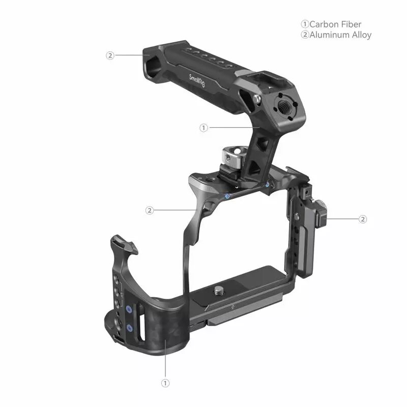 Ce kit comprend, une cage, une poignée supérieure et un serre-câble HDMI. La cage et la poignée supérieure sont très légères, car elles sont fabriquées en fibre de carbone.