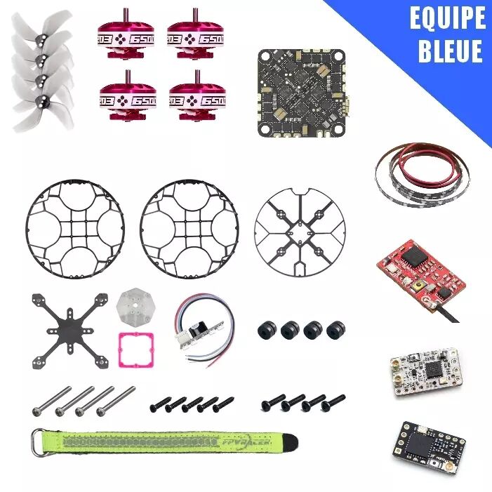 On retrouve 4 hélices 4 pales 2", un kit châssis seul, 4 moteurs MISS 1203-6500KV, un contrôleur de vol MR26-AIO-F411E25A, un jeu de LED et un récepteur au choix.