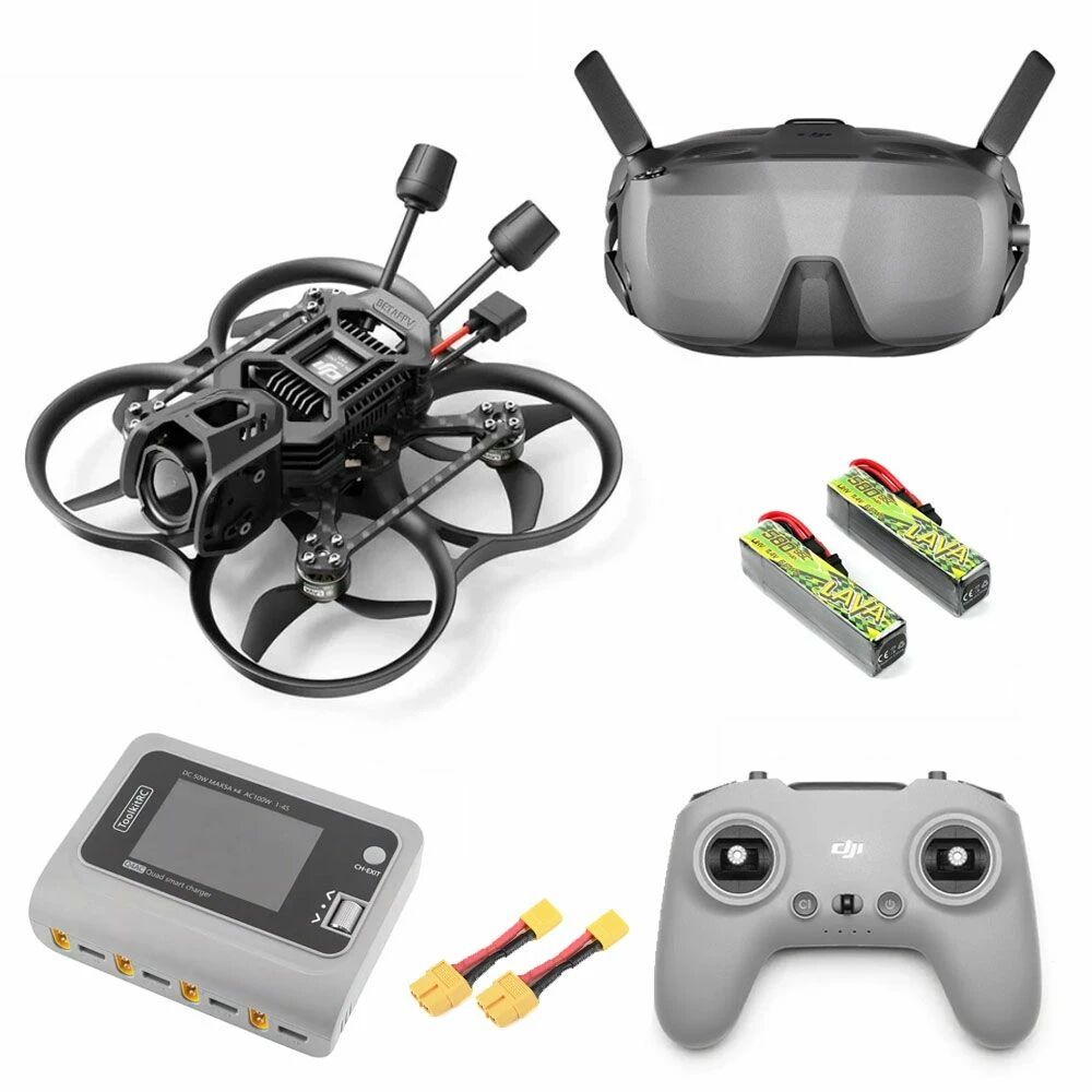 En plus du drone, vous retrouverez dans ce kit, 2 batteries LAVA II 3S 580mAh de BetaFPV, les Goggles N3 de DJI pour profiter du retour vidéo HD du Air Unit O4 Pro installé par l'Atelier FPV dans le Pavo 20 Pro II, un chargeur 4 voies Q4AC de ToolkitRC avec les adaptateurs XT60 vers XT30 pour charger vos batteries.