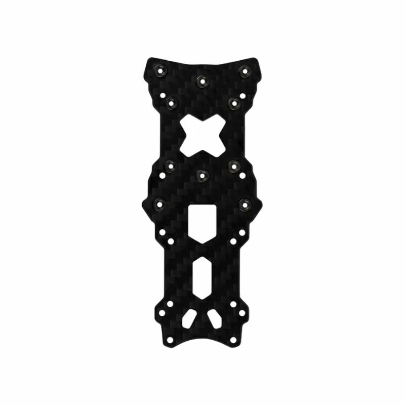 La plaque inférieure est en fibre de carbone haute résistance, avec une épaisseur de 2 mm. Elle reprend les points d'ancrage du Seeker 3, notamment l'alignement des trois trous par bras avec la middle plate, afin de retrouver la rigidité d'origine du châssis. Pour un pilote, l'enjeu est de retrouver un comportement de vol constant : une bottom plate saine limite les torsions qui peuvent dégrader la filtration gyro et la tenue en virage.